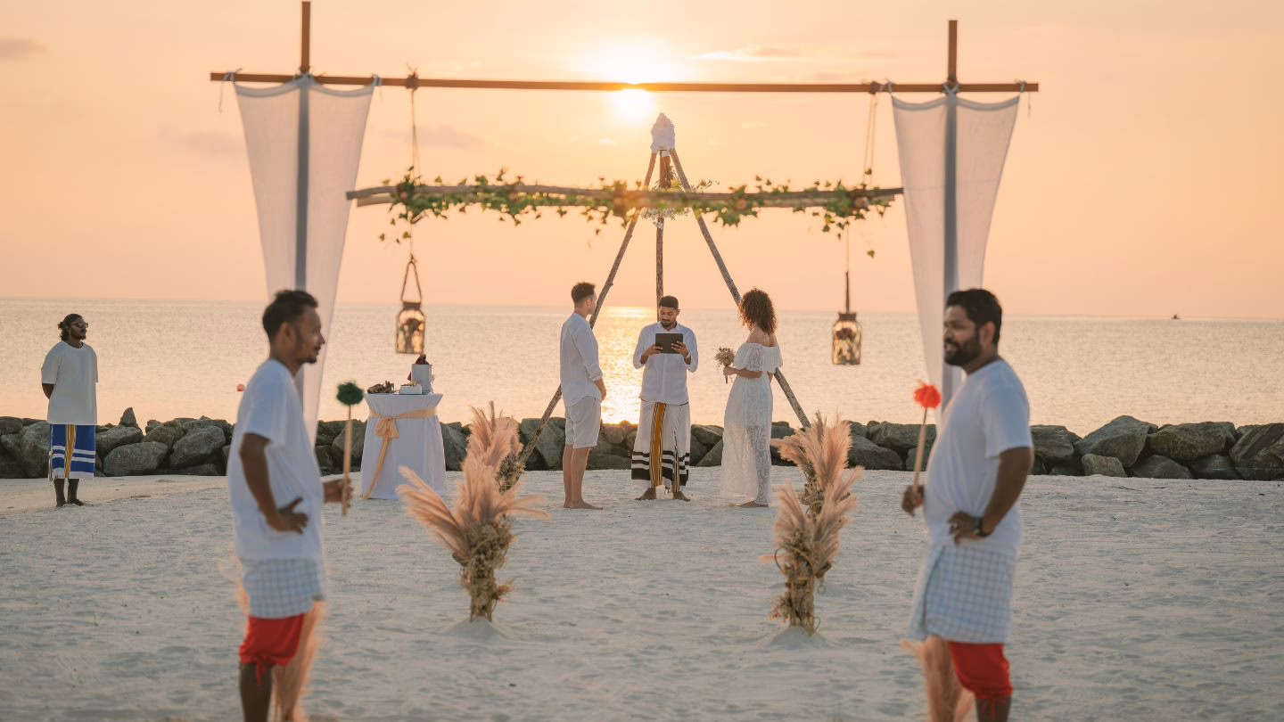 A specially designed private ceremony and reception with a Bottle of Bubbly during the ceremony to pop. Entails the sound of boduberu, wedding cake and more. Completed with a Private BBQ Dinner on the beach, a bed decoration to come home to and a float-stagram breakfast in the morning.