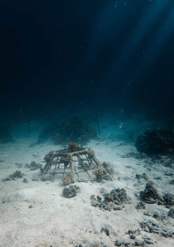 This exhibition is an urgent invitation to engage with the vulnerable underwater realm of the Maldives—the 95% that exists beneath the waves. For most, the experience is limited to the surface: pristine white sands and the turquoise sea. Tragically, what is “out of sight is all too often out of mind.” This hidden world of kaleidoscopic corals and majestic manta rays suffers silently from environmental destruction. This collection uses powerful photography to celebrate these natural wonders while bridging the gap between surface beauty and hidden crisis. The discarded “ghost gear” fishing net on the wall symbolizes the urgent, man-made threats they face. To allow us all to be part of this dialogue, the exhibition also invites viewers to an interactive piece within the villa: a Dive/Snorkel Logbook to document your discoveries, transforming your personal adventure into a vital contribution.
